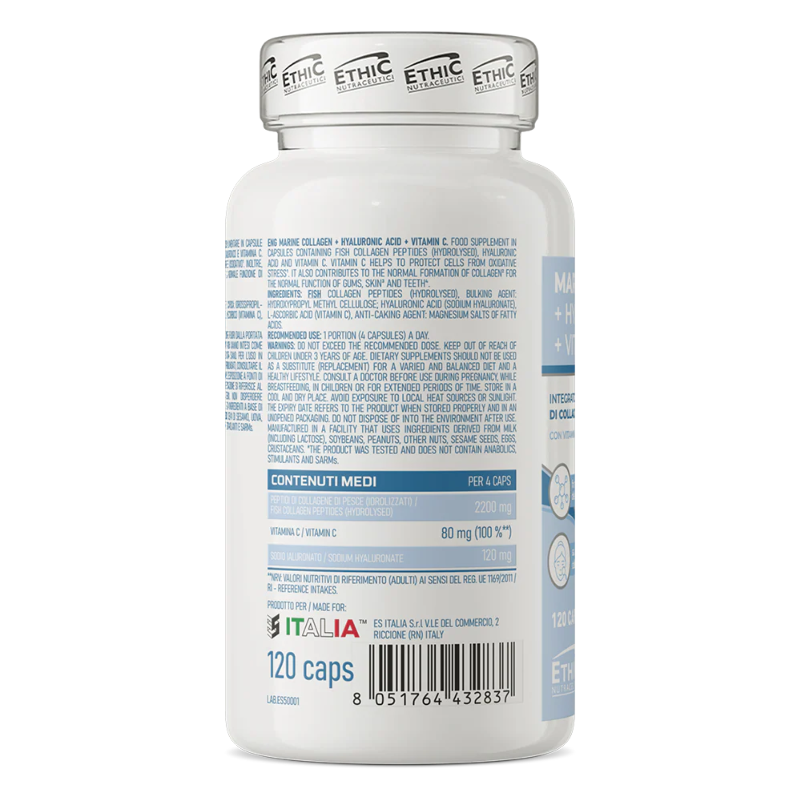 EthicSport Kolagen Rybi 120 kapsułek to suplement diety zawierający hydrolizowane peptydy kolagenowe pochodzenia rybiego, kwas hialuronowy oraz witaminę C. Produkt przeznaczony jest do uzupełniania codziennej diety w kolagen i witaminę C. Odpowiedni dla osób prowadzących aktywny tryb życia.